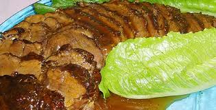 4. Αφήνετε να ησυχάσει 20 – 25 λεπτά, βγάζετε από το φούρνο, μεταφέρετε σε πιατέλα και κόβετε σε λεπτές φέτες. Βάζετε τους χυμούς από το ταψί σε κατσαρολάκι, αφού τους περάσετε από τουλπάνι και τους βράζετε σε χαμηλή φωτιά. Προσθέτετε το κορν φλάουρ διαλυμένο σε νερό και αφήνετε τη σάλτσα να δέσει. Αν χρειαστεί προσθέτετε λίγο νερό ή κορν φλάουρ. Περιχύνετε το κρέας και σερβίρετε.