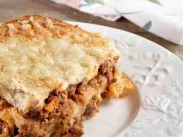 -Λαδώνετε το ταψάκι και στρώνετε στον πάτο 6 φέτες από το ψωμί του τοστ. Αδειάζετε πάνω τη μισή ποσότητα από τον κιμά, τον στρώνετε με τη ράχη ενός κουταλιού και πασπαλίζετε με κεφαλοτύρι. Συνεχίζετε την ίδια διαδικασία βάζοντας μια δεύτερη στρώση από το ψωμί του τοστ, μετά τον κιμά, μια δόση από τριμμένο κεφαλοτύρι και τέλος τις υπόλοιπες φέτες του ψωμιού.