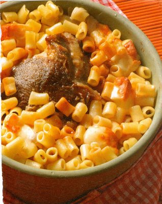 -Βράζουμε το μακαρονάκι μέχρι να κρατάει λίγο. Το σουρώνουμε, το μεταφέρουμε σε γιουβέτσι ή πυρέξ, το περιχύνουμε με το βούτυρο λιωμένο, προσθέτουμε το κρέας με το ζουμί του, το κεφαλοτύρι και ανακατεύουμε.