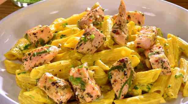 Νόστιμο και υγιεινό πιάτο οι πένες ολικής άλεσης με σολομό, κρόκο και φρέσκο κρεμμυδάκι