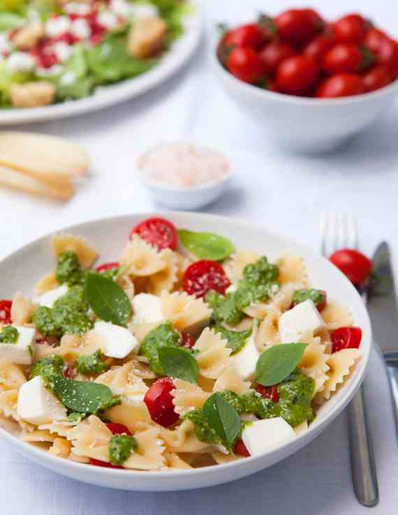 Βράστε τα ζυμαρικά σύμφωνα με τις οδηγίες της συσκευασίας. Ανακατέψτε το πέστο, με λίγο από το νερό των ζυμαρικών. Κόψτε τη μοτσαρέλα και τα ντοματάκια σε φέτες. Ανακατέψτε όλα τα υλικά μαζί και προσθέστε τα φύλλα του βασιλικού για γαρνιτούρα. Είστε έτοιμοι!