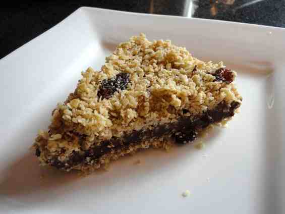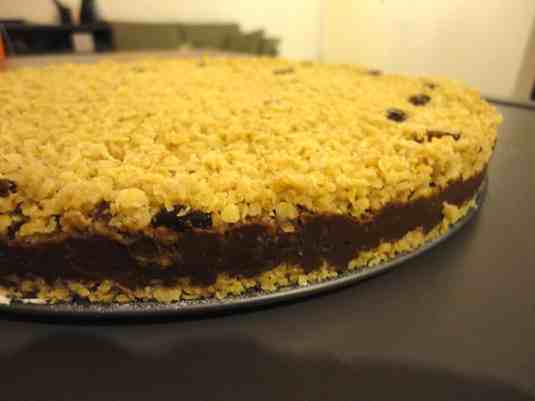 -Απλώνουμε αυτό το μείγμα σοκολάτας πάνω στη βάση που έχουμε φτιάξει με τη βρώμη και στη συνέχεια καλύπτουμε με το υπόλοιπο μείγμα της βρώμης.
