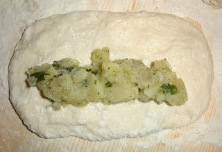 Σε ένα τηγάνι στη φωτιά βάζουμε 5 κουταλιές της σούπας ελαιόλαδο, ρίχνουμε το κρεμμύδι και το δυόσμο ψιλοκομμένο και μόλις πάρουν χρυσαφένιο χρώμα προσθέτουμε την πατάτα με αλάτι και πιπέρι. Ανακατεύουμε μερικές φορές να ενωθούν καλά τα υλικά, αποσύρουμε από τη φωτιά και αφήνουμε τη γέμιση να κρυώσει.