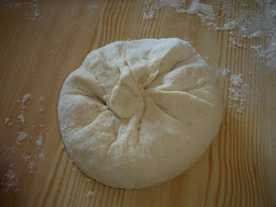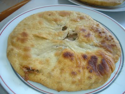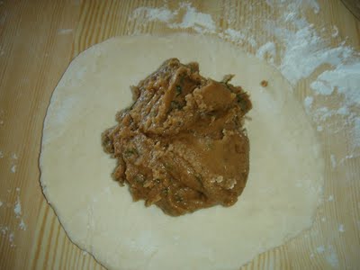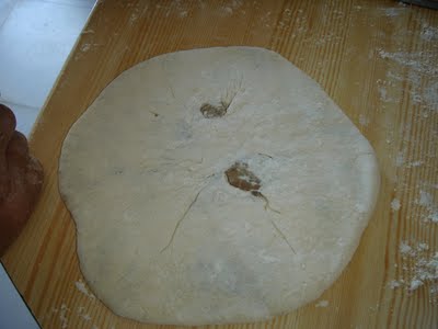 Ανοίγουμε κάθε κομμάτι ζύμης σε ένα φύλλο σχετικά παχύ, βάζουμε στο κέντρο τη γέμιση, κλείνουμε καλά σαν λυχναράκι και με τον πλάστη ανοίγουμε πάλι την πίτα να