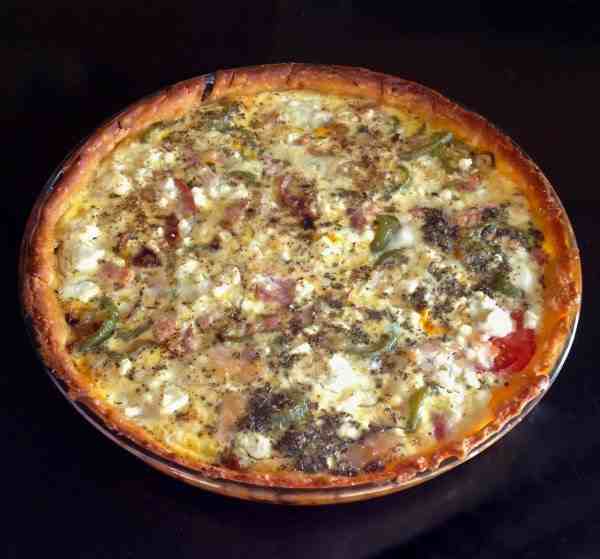 Στρώνετε τη σφολιάτα σε φόρμα στρογγυλή και κόβετε ό,τι περισσεύει στα τοιχώματα. Αδειάζετε ομοιόμορφα στη βάση της τα κρεμμύδια με τις πιπεριές και προσθέτετε πάνω τους οριζόντια τις φέτες της ντομάτας. Μοιράζετε τα κομματάκια του μπέικον, την τριμμένη φέτα και το πεκορίνο και ρίχνετε πάνω τους τα αβγά.