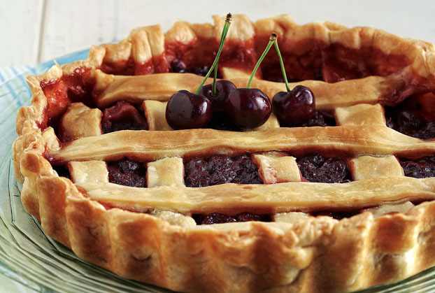 Για τη γέμιση: Βάζουμε τα κεράσια σε μπολ, τα περιχύνουμε με το λεμόνι, πασπαλίζουμε με τη ζάχαρη, προσθέτουμε την κανέλα και τα ανακατεύουμε καλά. Σε μικρή κατσαρόλα βάζουμε τη μαρμελάδα, το κονιάκ και το βούτυρο, σιγοβράζουμε (πάντα σε χαμηλή φωτιά) για 5΄ αποσύρουμε από τη φωτιά και αφήνουμε το μείγμα στην άκρη, να κρυώσει. Βουτυρώνουμε μία ταρτιέρα με αποσπώμενη βάση. Απλώνουμε μέσα τα 2/3 της ζύμης. Τη στρώνουμε με τα δάχτυλα στη βάση καθώς και στα τοιχώματα. Απλώνουμε το μείγμα μαρμελάδας στη ζύμη. Σουρώνουμε τα κεράσια από τα υγρά τους και τα στρώνουμε στην τάρτα. Τοποθετούμε την υπόλοιπη ζύμη ανάμεσα σε 2 λαδόκολλες και με τον πλάστη την ανοίγουμε σε φύλλο. Κόβουμε με ροδάκι λωρίδες κάθετες και τις πλέκουμε στην τάρτα. Ψήνουμε την κερασόπιτα για περίπου 30΄ στους 190οC μέχρι να ροδίσει.