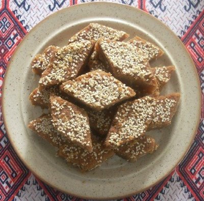 Βάζουμε όλο το λάδι σε μια κατσαρόλα στην φωτιά να κάψει. Ρίχνουμε το αλεύρι σιγά σιγά και ανακατεύουμε συνέχεια, με την ξύλινη κουτάλα μας, μέχρι να πάρει ξανθοκόκκινο χρώμα. Σε άλλη κατσαρόλα έχουμε βάλει το νερό με τη ζάχαρη να βράζει κι έχουμε έτοιμο το σιρόπι ζεστό. Σιγά σιγά με μια κουτάλα της σούπας ρίχνουμε το σιρόπι μέσα στην άλλη κατσαρόλα που έχουμε τη ζύμη της πίτας. Ανακατεύουμε συνεχώς. Προσθέτουμε σουσάμι και κανέλα Η ζύμη μας πρέπει να είναι ομοιόμορφη και μαλακή. Να μην είναι ούτε πολύ σφιχτή ούτε μαλακή και να έχει ελαφρώς σκούρο χρώμα, δείγμα του ότι το αλεύρι έχει ψηθεί καλά. Στρώνουμε το υλικό στο ταψί μας, αφού το πασπαλίσουμε με σουσάμι και φροντίζουμε η απλωμένη ζύμη να μην είναι ούτε πολύ λεπτή ούτε πολύ παχιά. Στρώνουμε λαδόκολλα από πάνω και πατάμε να την στρώσουμε για να είναι ευπαρουσίαστη. Πασπαλίζουμε με σουσάμι, κανέλα και λίγη ζάχαρη. Κόβουμε την πίτα μέχρι κάτω σε ρόμβους και σε κάθε ρόμβο βάζουμε ένα ασπρισμένο αμύγδαλο. Την ψήνουμε σε 200 βαθμούς Κελσίου περίπου μια ώρα. Με το μαχαίρι δοκιμάζουμε τη ζύμη αν κολλάει και όταν δεν κολλάει σημαίνει ότι η πίτα είναι έτοιμη. Τη βγάζουμε από το φούρνο.