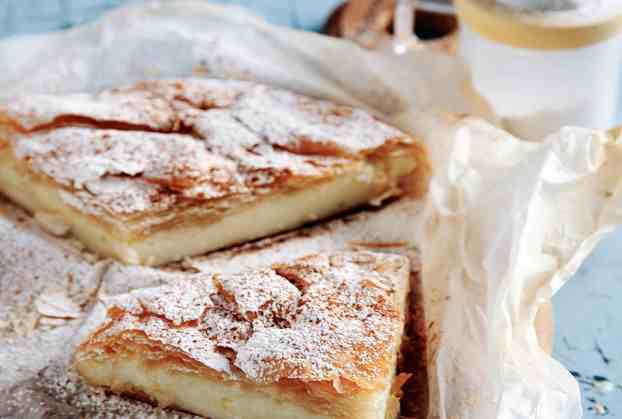 -Βουτυρώνουμε ένα ρηχό ταψί για πίτα 34 ή 36 εκ. Στρώνουμε ακτινωτά (να περισσεύει πολύ φύλλο έξω) 9 φύλλα ραντίζοντάς τα ενδιάμεσα µε λίγο λιωμένο βούτυρο. Αδειάζουμε την κρύα κρέμα σε λεπτή στρώση. Γυρίζουμε προς τα µέσα τα φύλλα που εξέχουν, πάνω στην κρέμα. Καλύπτουμε µε τα υπόλοιπα βουτυρώνοντάς τα καλά µε το πινέλο. Μπήγουμε τα περισσεύματα μέσα στο ταψί µε σπάτουλα, όπως στο γαλακτομπούρεκο.