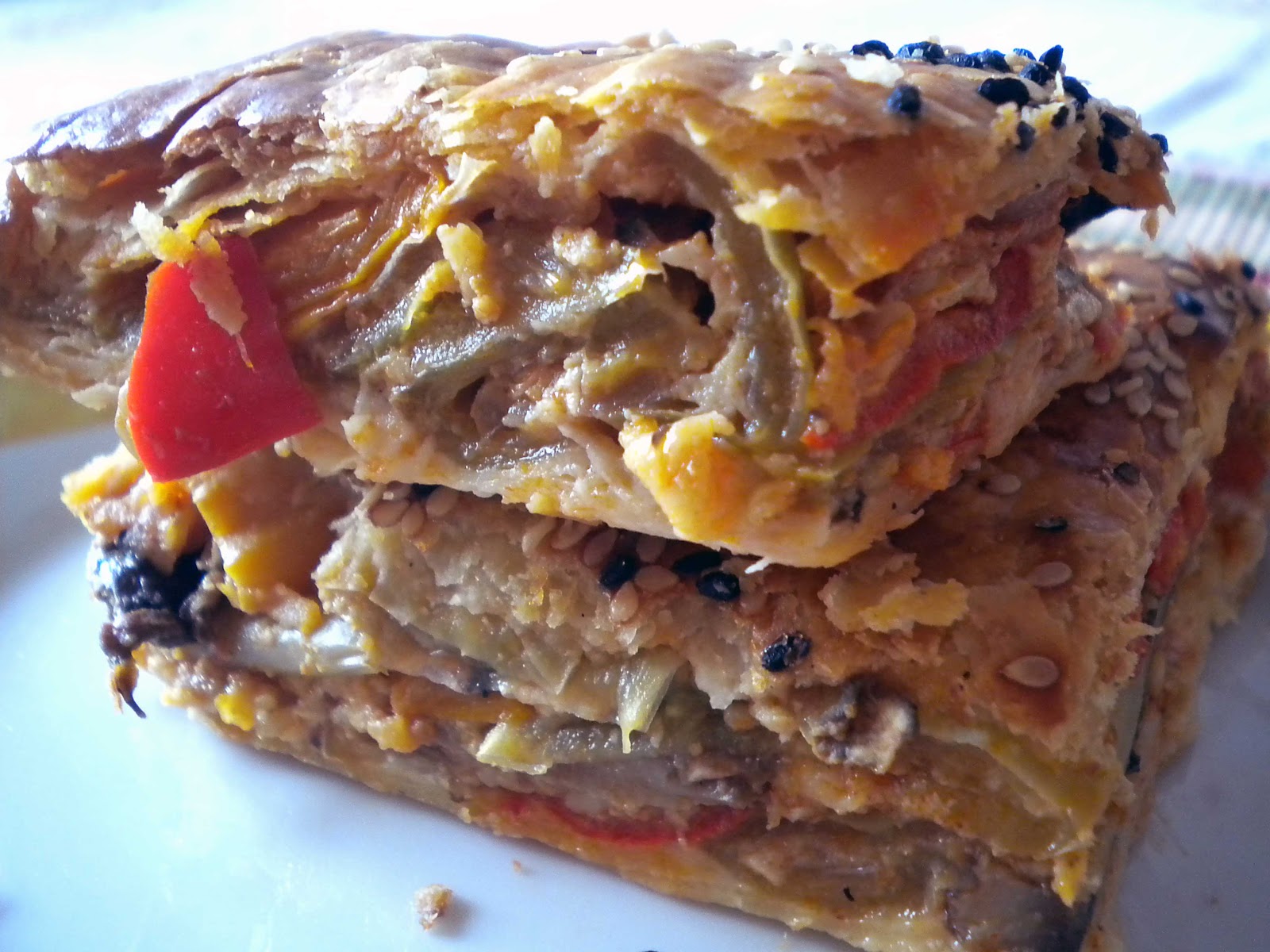 -Απλώνω σε λαδόκολλα ένα φύλλο σφολιάτας. Προσθέτω τη γέμιση, την απλώνω καλά και καλύπτω με το δεύτερο φύλλο. Τυλίγω τις άκρες που περισσεύουν. Αλείφω την πίτα με το αβγό και πασπαλίζω με το σουσάμι και το μαυροκούκι. Ψήνω στο φούρνο στους 180°C για 50'.