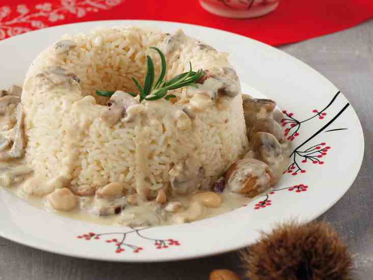 Βράζετε το ρύζι μετρητό (1 προς 3 περίπου ανάλογα με τον τύπο). Το σουρώνετε,το βουτυρώνετε ελαφρά και το κρατάτε ζεστό. Συγχρόνως ετοιμάζετε τη σάλτσα. Ζεσταίνετε το ελαιόλαδο μαζί με το βούτυρο και σοτάρετε το κρεμμύδι δίχως να το μαυρίσετε. Προσθέτετε τα αμύγδαλα και τα ροδίζετε για λίγα λεπτά. Ρίχνετε και τα μανιτάρια και τα σοτάρετε μέχρι να μαλακώσουν, να βγάλουν τους χυμούς τους και να ροδίσουν. Τελευταία προσθέτετε τα κάστανα και τα αναμειγνύετε μαζί με τα υπόλοιπα υλικά και με προσοχή για να μην λιώσουν. Σβήνετε τη σάλτσα με τη Vodka, κλείνετε τη φωτιά, προσθέτετε την κρέμα γάλακτος,αλατοπιπερώνετε και ανακατεύετε. Σερβίρετε το ρύζι στα πιάτα και από πάνω ρίχνετε τη σάλτσα ζεστή.Ρίχνετε φρεσκοτριμμένο τυρί της αρεσκείας σας και πιπέρι από το μύλο του πιπεριού.