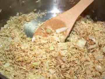 -Σωτάρετε 1 κρεμμύδι μέτριο ψιλοκομμένο με 2 κουταλιές σούπας βούτυρο μέχρι να μαραθεί. Ρίχνετε 1 φλ. τσαγιού ρύζι και σωτάρετε μερικά λεπτά.