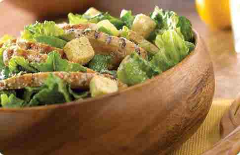 Ρίχνουμε τη βινεγκρέτ πάνω από τη σαλάτα. Ανακατέυουμε καλά και ρίχνουμε τα κρουτόν και την παρμεζάνα. Ανακατεύουμε ελαφρώς.