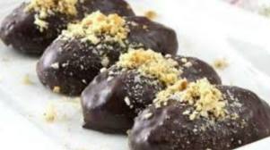3. Αφού καλύψουμε τους κουραμπιέδες με τη σοκολάτα, τους αφήνουμε σε μια σχάρα να στεγνώσουν. Αν θέλουμε πασπαλίζουμε με άχνη ή κακάο.