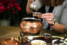β) σερβίρεται σε μικρό φλιτζάνι με αμύγδαλα και σταφίδες ή σε ποτήρια μπύρας