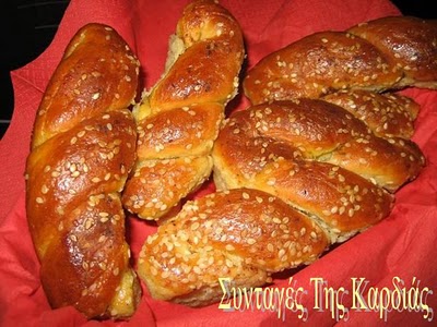 Από πάνω αλείφουμε με αυγό χτυπημένο, πασπαλίζουμε με σουσάμι, κανέλλα και βουτώντας το δάχτυλό μας σε σκόνη γαρύφαλλο, ακουμπάμε κατά τόπους το κουλίκι, κάνοντας «δαχτυλιές» με το γαρύφαλλο.