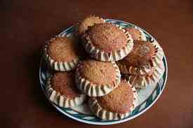 Ενώνουμε όλα τα υλικά της γέμισης και τα ανακατεύουμε με κουτάλι ή στο μίξερ. Κοσκινίζουμε σε λεκάνη το αλεύρι με το αλάτι. Προσθέτουμε σε κομματάκια τη μαργαρίνη και ψιχουλιάζουμε με τα δάχτυλα (τρίβουμε το μείγμα, να γίνει σαν βρεγμένη άμμος). Κάνουμε λακκούβα, προσθέτουμε το γιαούρτι, το αυγό, τη ζάχαρη. Ζυμώνουμε καλά και τυλίγουμε τη ζύμη σε μεμβράνη. Την αφήνουμε για 45΄ στο ψυγείο να ξεκουραστεί. Χωρίζουμε τη ζύμη σε κομμάτια και πασπαλίζοντας αλεύρι όποτε είναι αναγκαίο, ανοίγουμε τα κομμάτια σε πολύ λεπτό φύλλο. Με κουπ πατ ή με ροδάκι κόβουμε δίσκους ζύμης 10 εκ. Σε κάθε φύλλο ακουμπάμε 1 κ.γλ. γέμιση. Ανασηκώνουμε τα πλαϊνά τσιμπώντας τα, φυλακίζοντας μέσα τη γέμιση. Τα αραδιάζουμε σε λαδωμένες λαμαρίνες. Τα αλείφουμε με χτυπημένο αυγό. Τα ψήνουμε στους 180οC για 25΄, να ροδίσουν. Πασπαλίζουμε με κανέλα.