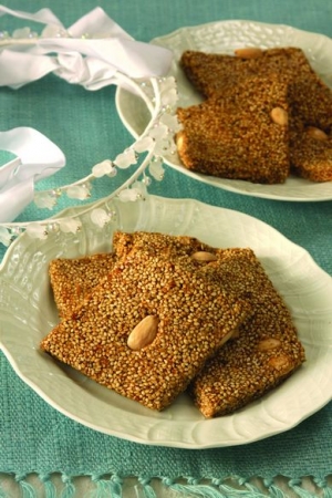 -Σε βαθύ μεγάλο μπολ ανακατεύουμε το σουσάμι με την κανέλλα και τα αμύγδαλα (τα οποία έχουμε επίσης καβουρδίσει καλά στο φούρνο). Εν τω μεταξύ βάζουμε το μέλι σε βαθιά, απλωτή κατσαρόλα και το τοποθετούμε σε δυνατή φωτιά.
