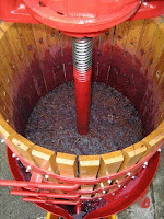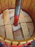 Αφού γεμίσουμε το πιεστήριό μας με τα στέμφυλα τα στύβουμε μέχρι να πάρουμε όλα το χυμό που έχουν. Εδώ συναντήσαμε ένα μικρό προβληματάκι. Η ποσότητα των σταφυλιών μας δεν ήταν αρκετά μεγάλη και το πιεστήριό μας δεν θα μπορούσε να το πιέσει τόσο χαμηλά για αυτό προσθέσαμε μερικά ξύλα ακόμα όπως θα δείτε στις φωτογραφίες.