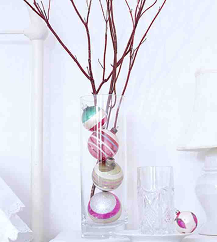 Ένας όμορφος και απλός τρόπος για το στολισμό για τις διακοπές είναι να καλύψετε ένα ψηλό ποτήρι με μια απλή σύνθεση από πολύχρωμα στολίδια που θα μπορούσαν να ταιριάζουν με την παλέτα χρωμάτων των δωματίων ή θα μπορούσατε να πάτε με τα παραδοσιακά χρώματα των κόκκινων και των πράσινων στολιδιών, καθώς και να προσθέστε μερικά γυμνά κλαδιά.