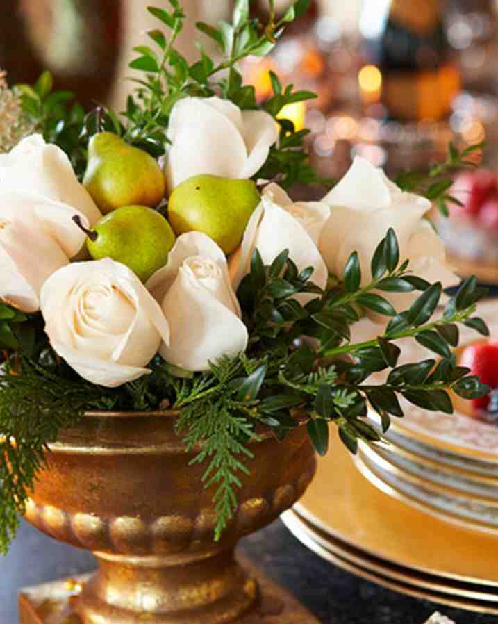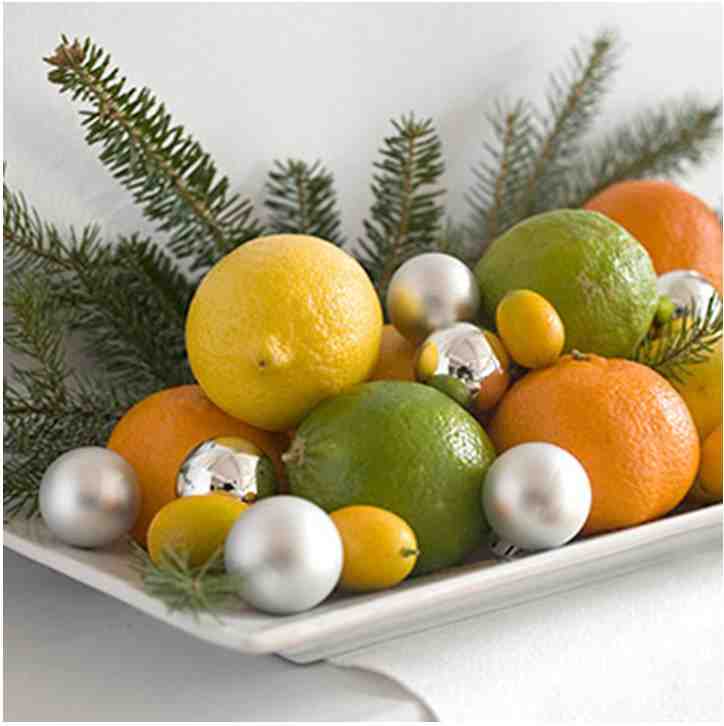 Μια ωραία ιδέα για να ζεσταθεί ένα κεντρικό τραπέζι είναι να χρησιμοποιήσετε κάποια εσπεριδοειδή, λεμόνι, λάιμ, πορτοκάλια και ίσως κάποια κουμκουάτ. Συμπληρώστε τα κενά με μικρά κομμάτια από κλωναράκι του πεύκου και μερικά μικροσκοπικά στολίδια.