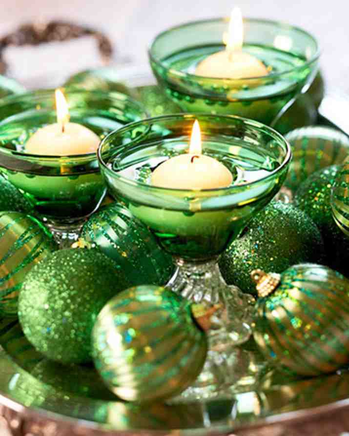 Μια απλή παλέτα χρωμάτων μπορεί να κάνει μια τολμηρή δήλωση διακόσμησης. Το ακόλουθο παράδειγμα δείχνει φλιτζάνια πράσινο πουτίγκα μαζί με κάποια λαμπερά πράσινα στολίδια, που κάθενται στην κορυφή ενός ασήμι δίσκου. Μια τελευταία προσθήκη τα επιπλέοντα κεριά που φωτίζει τη σύνθεση.