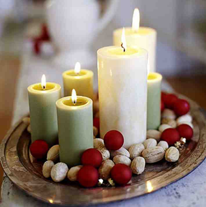 Αναμείχτε κάποια μαλακά κεριά ανάμεσα μέσα σε ένα δίσκο με μικροσκοπικά κόκκινα στολίδια και ξηρούς καρπούς.